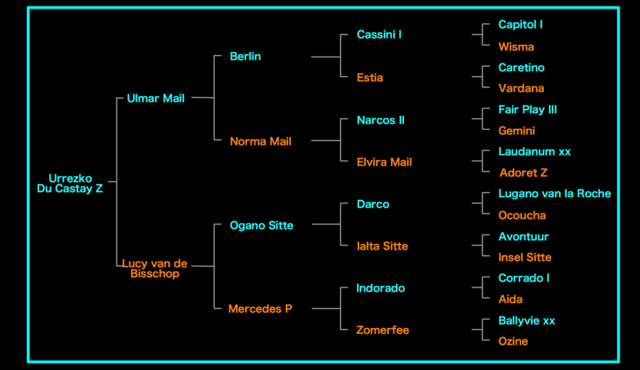 La mère d'Urrezko est Lucy van de Bisschop, une fille de l'étalon belge Ogano Sitte. Ogano Sitte a produit plus de 20 étalons autorisés et de nombreux descendants concurrents à tous les niveaux. Il a été le meilleur père en Belgique en 2007 et 2008. Ses descendants sont notés comme étant très facile à manipuler et rouler. Le grand-père de Lucy est la légende internationale Darco, qui a concouru sous la selle de Ludo Phillipaerts. Darco était n° 1 dans le classement de WBSFH pour une incroyable cinq années successives. Ses fils sous licence comprennent Nonstop, Winningmood, Bamako de Muze, Parco, Darc Rouge, Twister de la Pomme, et il dispose dans les pedigrees des milliers de concurrents à travers l'Europe. La ligne maternelle d'Ogano Sitte comprend le sauteur international Ialta Sitte avec 71 placements et victoires internationaux,, la jument elite Insel Sitte et la grand-mère Gute Sitte, médaillée olympique à Montréal avec Eric Wauters et élu le meilleur cheval de l'année en 1976.