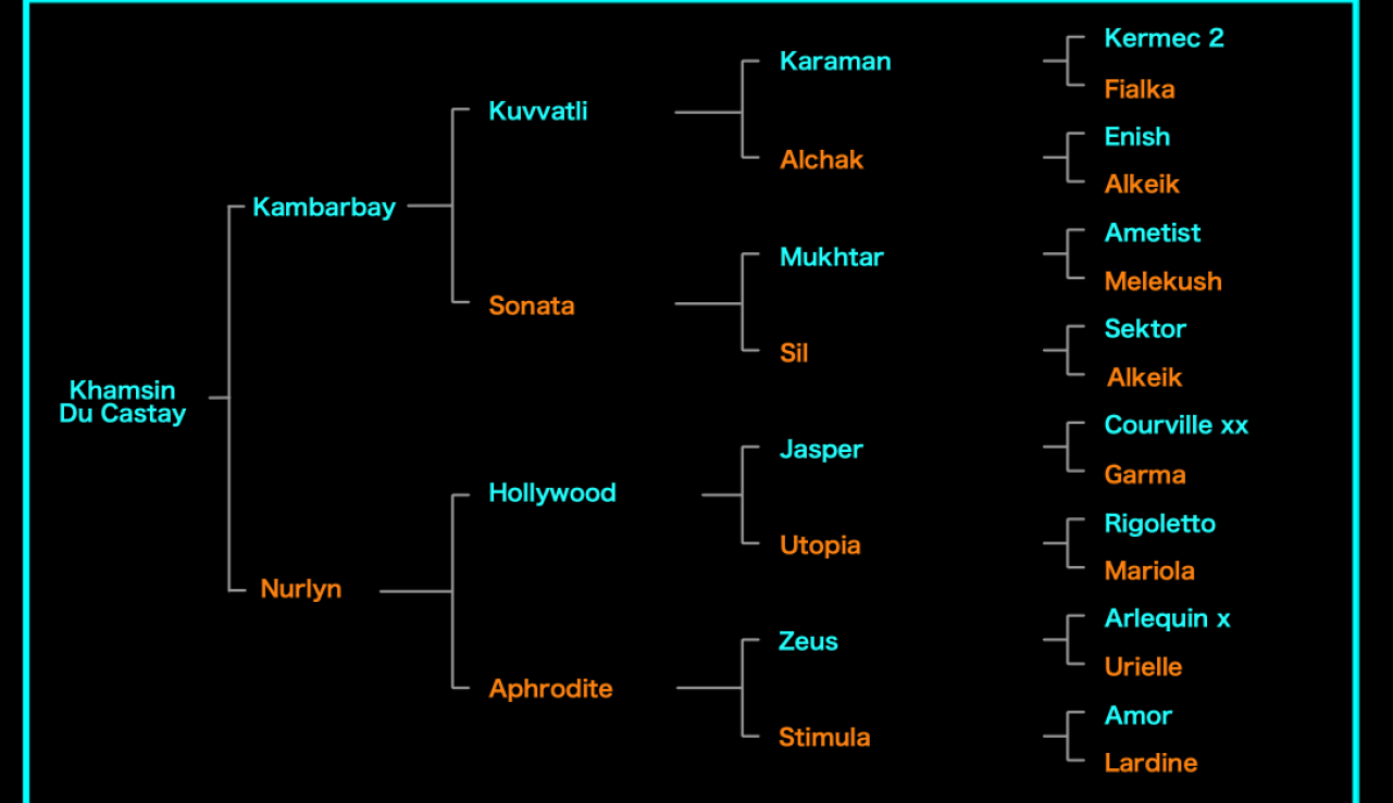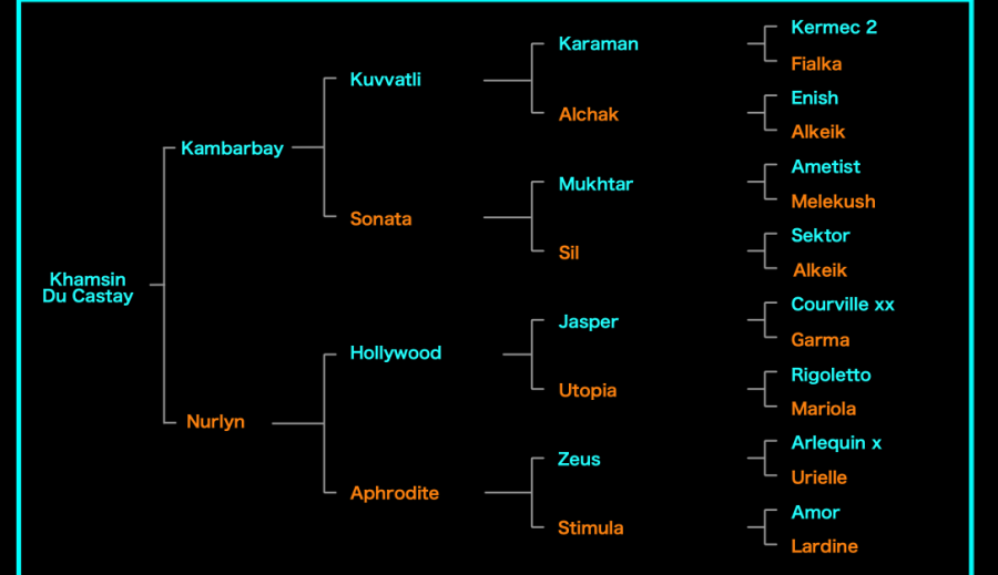 La mère de Khamsin, Nurlyn, est la mère de Maybe Tonight Du Castay, finaliste de CCE 6ans à Pompadour en 2018 avec Marlène Garcia, classé en plusiers concours CCE cycle classique. Elle à aussi produit Jazador du Castay (Canabis Z x Hollywood), qui sort sous la selle de Melanie Etcheverry. Son père Hollywood participé avec succès au niveau international avec le cavaliuer allemand Heinrich Engemann, avec des victoires en GP à Barcelonne, Munich, Nuremberg, Affaltebach and Steinhagen. Son père est le célébré Jasper, qui a sauté au plus haut niveau sous le nom de Little One avec Hugo Simon. La mère de Hollywood est la KWPN jument star de performance Utopia.