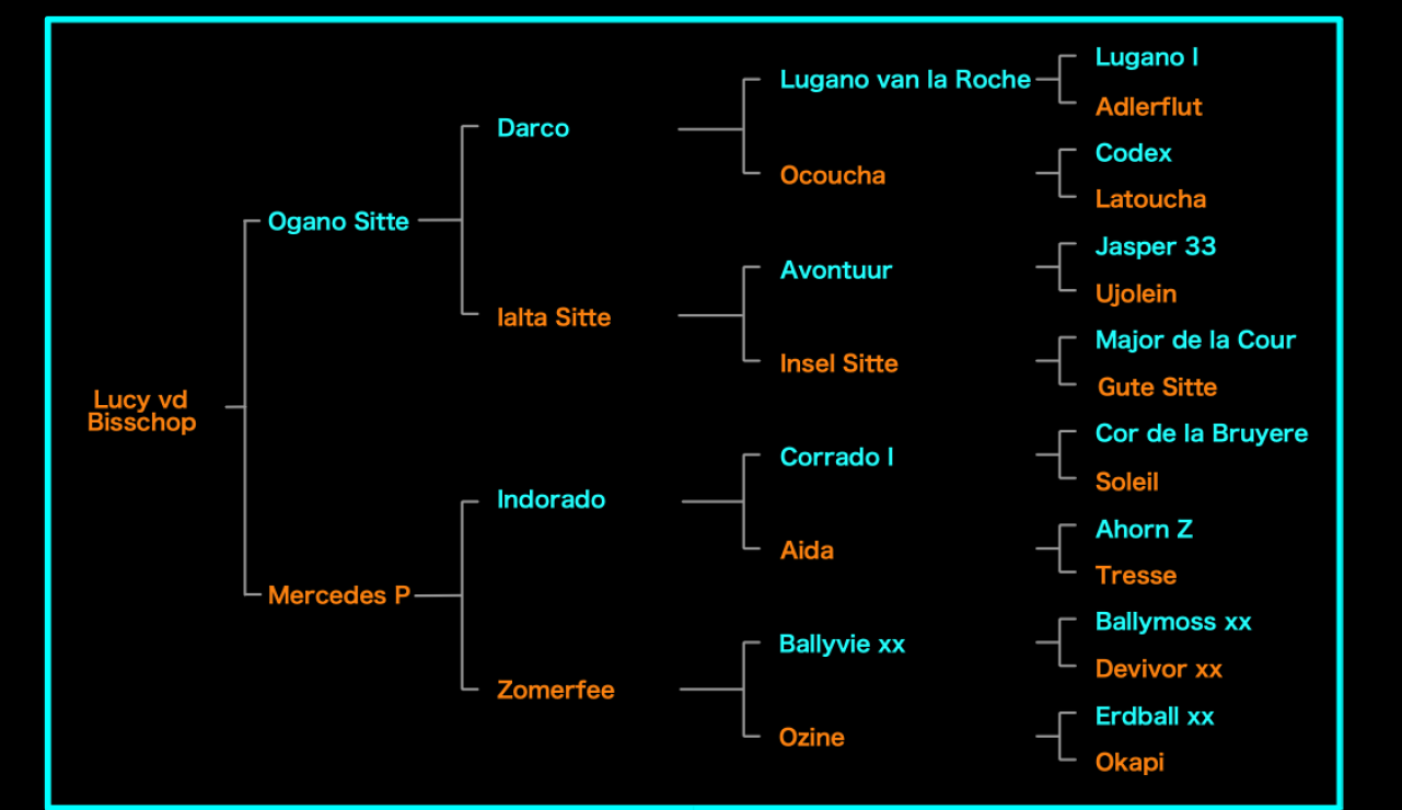 Mère Mercedes P est une jument KWPN "Preferent". Grâce à son père, Indorado, elle porte le sang des meilleurs étalons Corrado, Cor de la Bruyere, Ahorn Z et Caletto . Cet étalon KWPN "Keur" connu beaucoup de succès au niveau international avec Jur Vreiling. Indorado est bien connu pour produire des grands progénitures avec des lignes longues et une portée illimitée, et a de nombreux descendants classés en compétition internationale. Mercedes est de la lignée maternelle "Isabella" (Hannover Stamm 827 ). Sa 2e mère Zomerfee et 3e mère Ozine ont atteint les prédicats «Ster prestatie" de KWPN . Le sang est fourni par son grand-père, le pur-sang irlandais Ballyvie xx.
