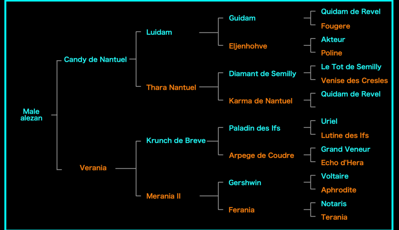Le père de Candy, Luidam, a perfomé à plus haut niveau avec Brian Twoomey, notamment vainqueur des Coupes de Nations aux CSIO5* de Dublin, Saint Gall et Aix la Chapelle en 2003. Il était père aussi de grand vainqueur Ninja La Silla.